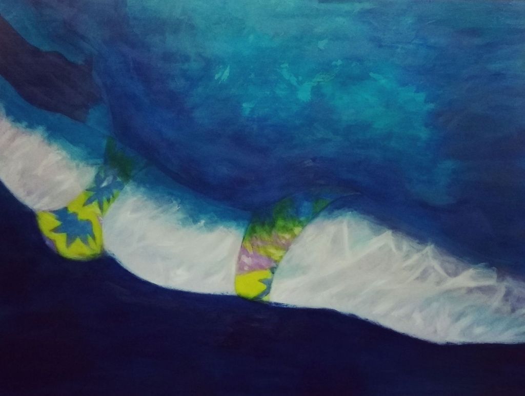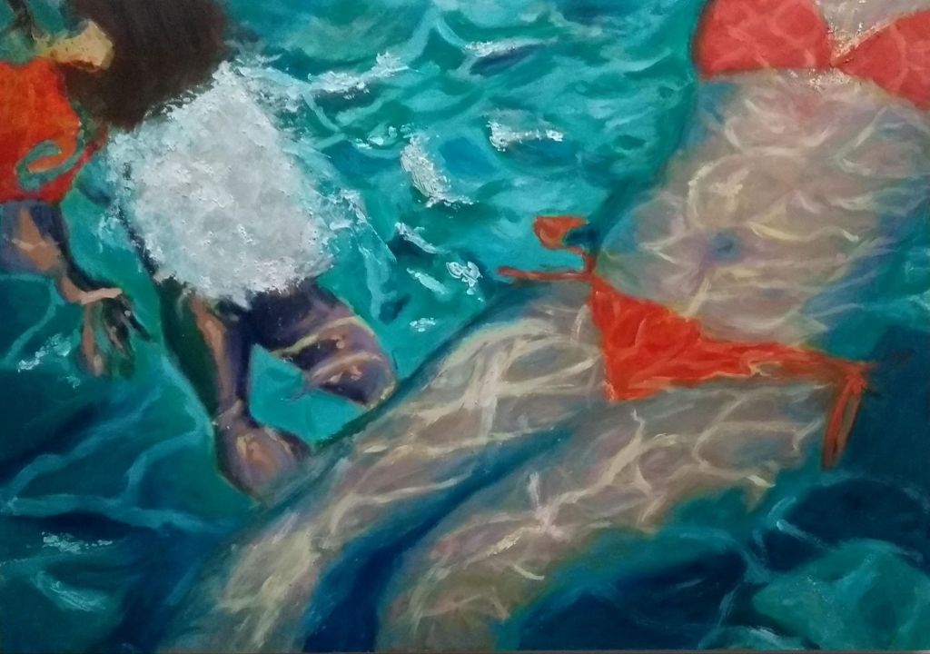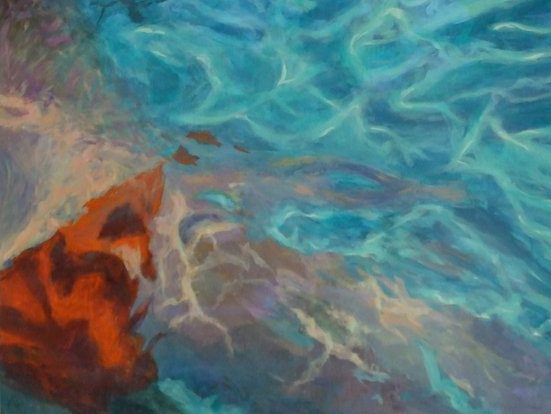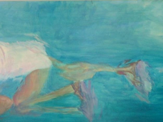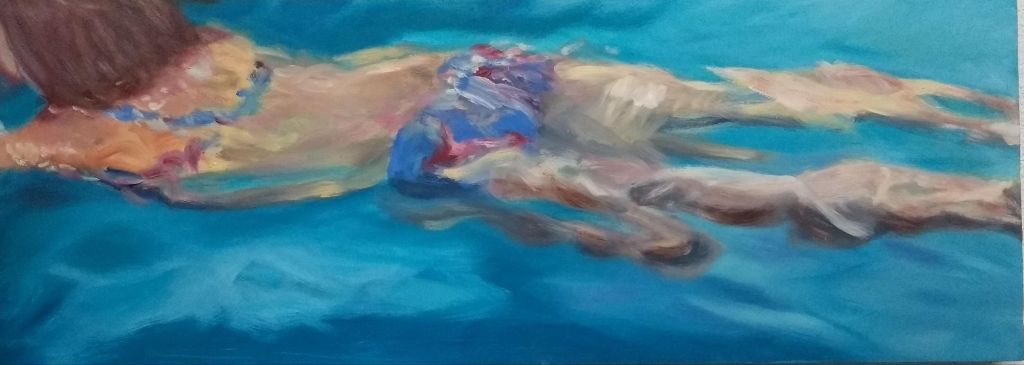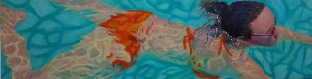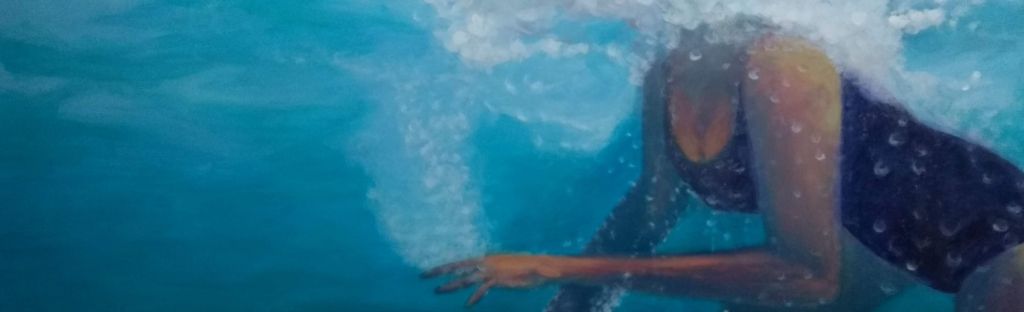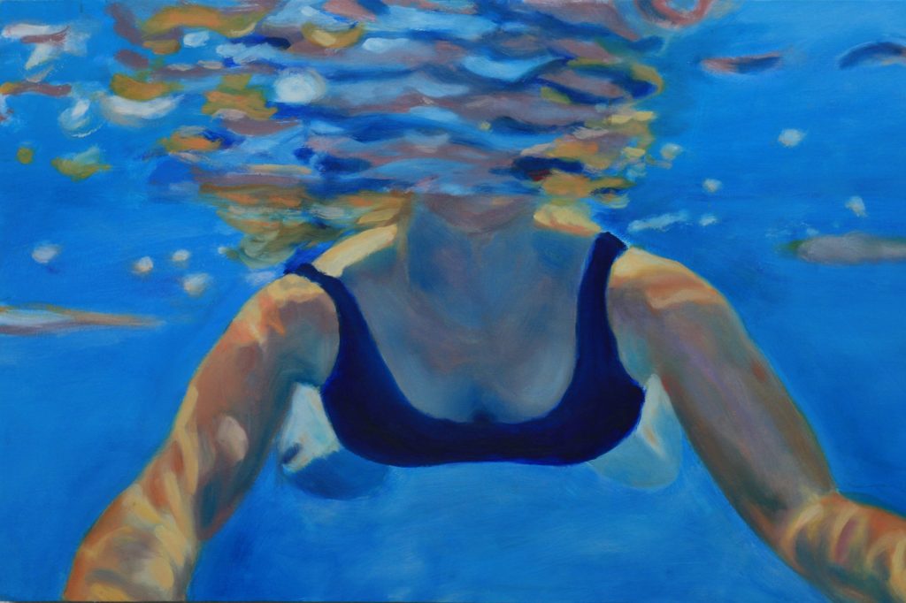 I am fascinated by how the body is refracted in water and how the light is polorized under the water. Each painting is an endeavour to describe these varying conditions and form in a different way. Style of application varies depending on the subject. The conditions are extremely impermanent, the painting is a ‘snap shot’ of a moment that only exists for a nano fraction of time. The paintings hopefully reflect this. The blue of the pool especially in Mediterranean light conditions is reminiscent of a gorgeous joyful and playful memory. Like a fragment of good times remembered.