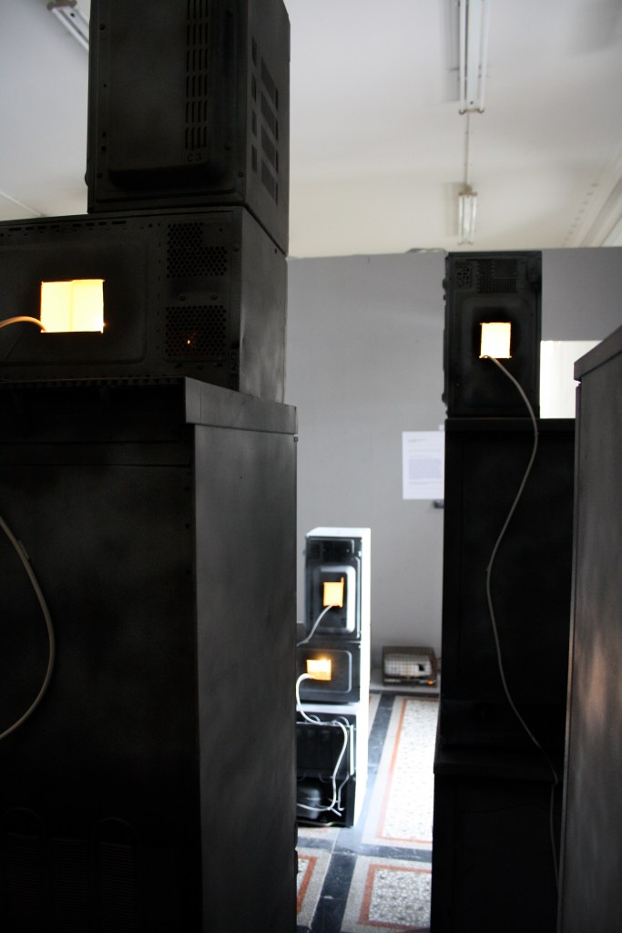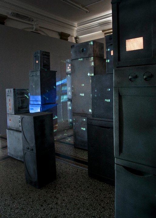 This was a large scale installation using found objects with video elements and projection with sound elements. The found object were mostly recycled white goods repainted. Some of the objects had video elements inside.