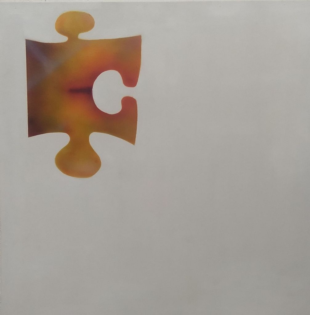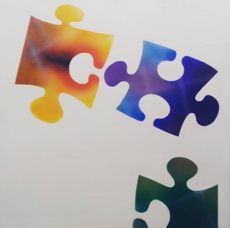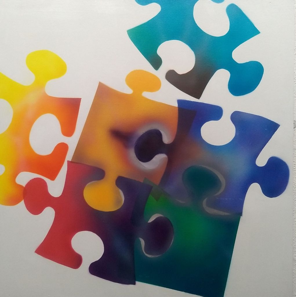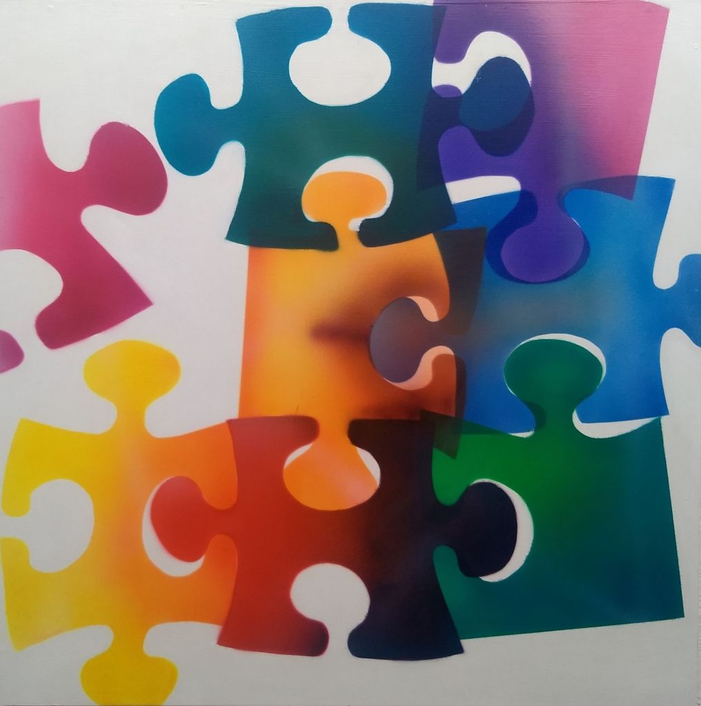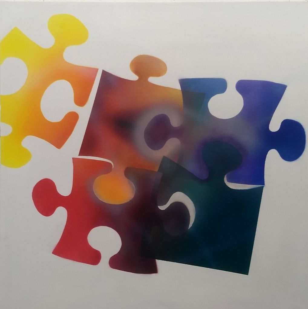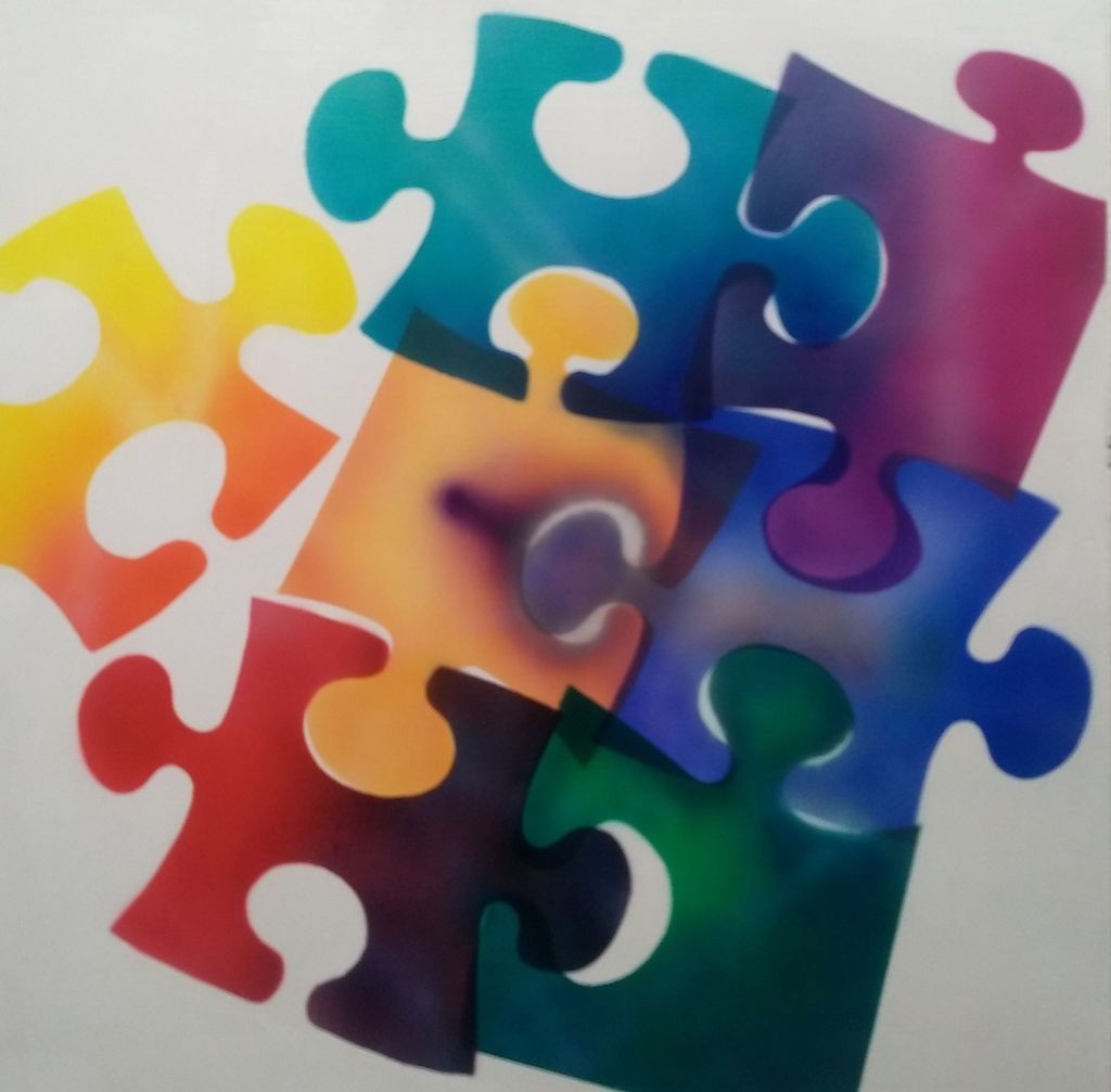 This work is intended to be an allegory of community spirit. A community is a collective of individuals who together, can realise common goals for the benefit of all. I have used jigsaw pieces as a metaphor for the individual. Colour, tone and hue indicates the influence and change that interaction has on the individuals within the group. None of the jigsaw pieces fit together exactly, as in real life no individual is exactly the same as the next, the concerns and motives vary from person to person. However the pieces endeavor to fit together, just as in a community group the individuals have to fit and work together the best they can, for ultimate harmony and the benefit of all. Each individual strives to find a niche within the group that suits his or her needs within the group, despite the enigma of the group dynamics.